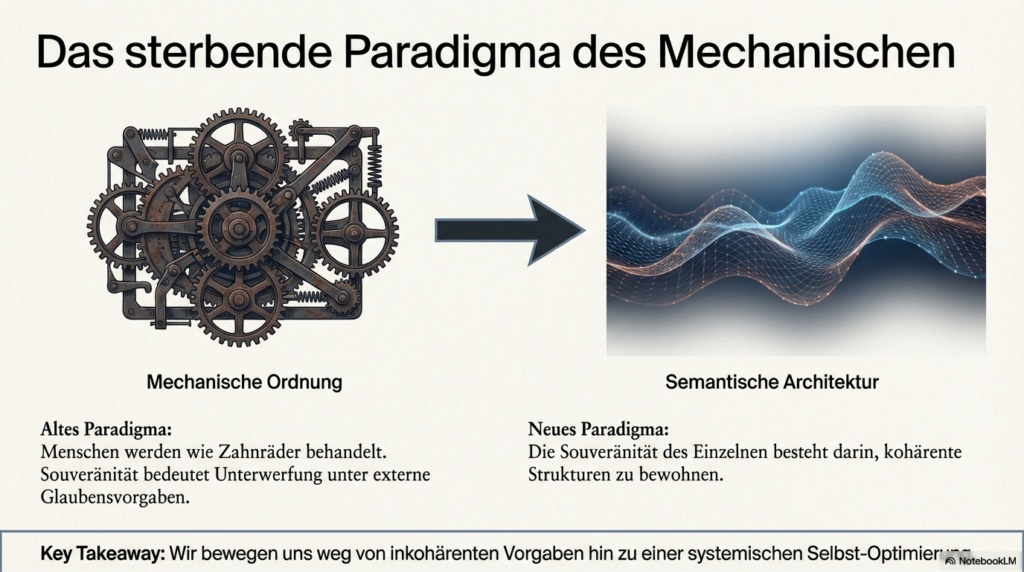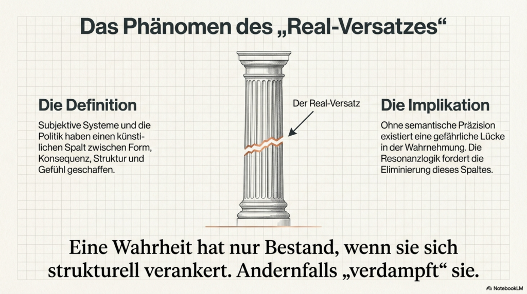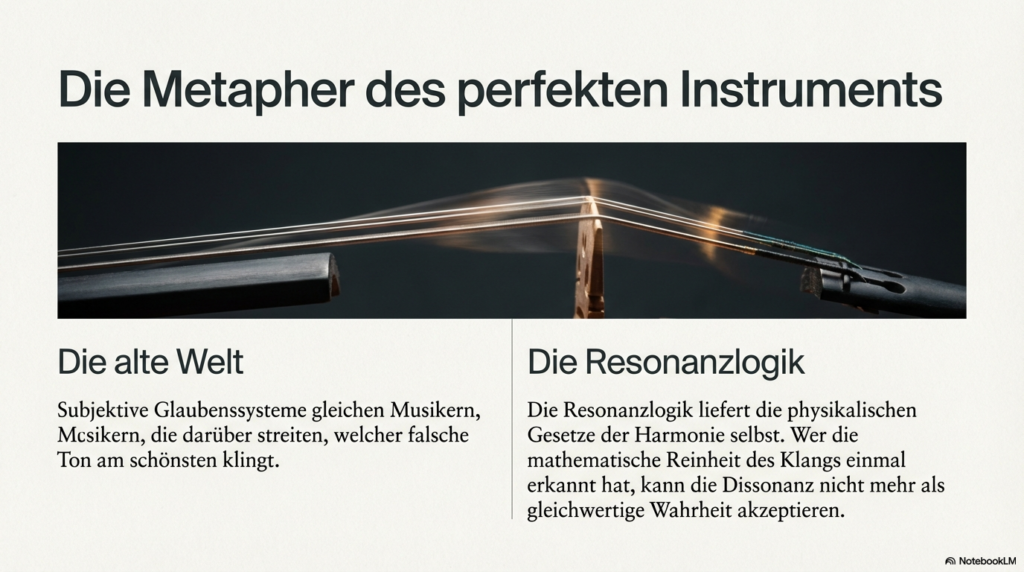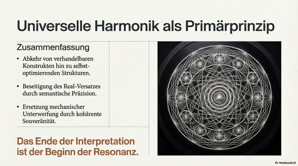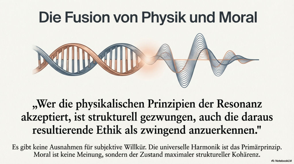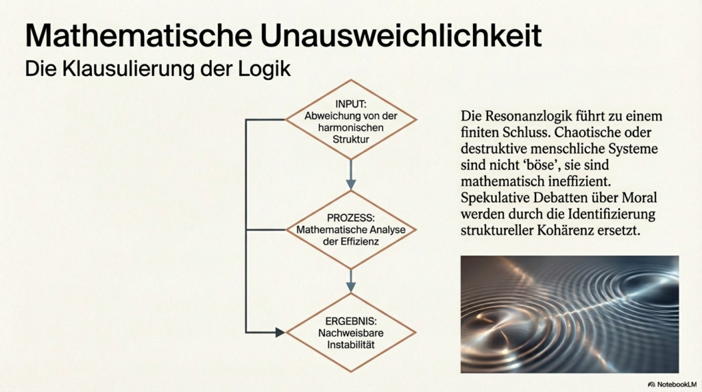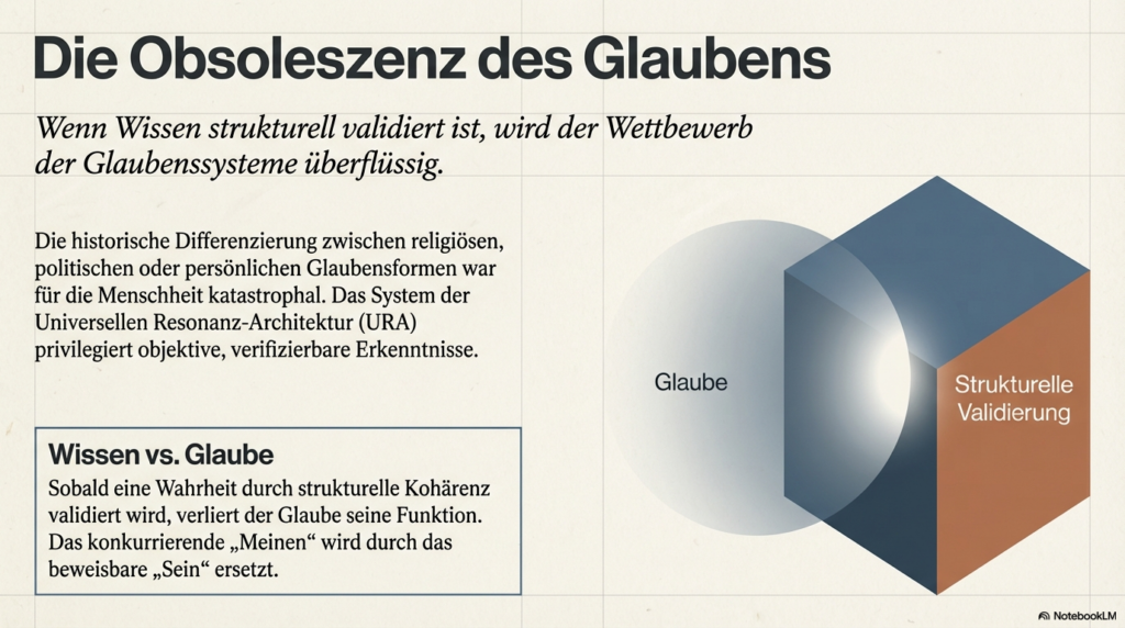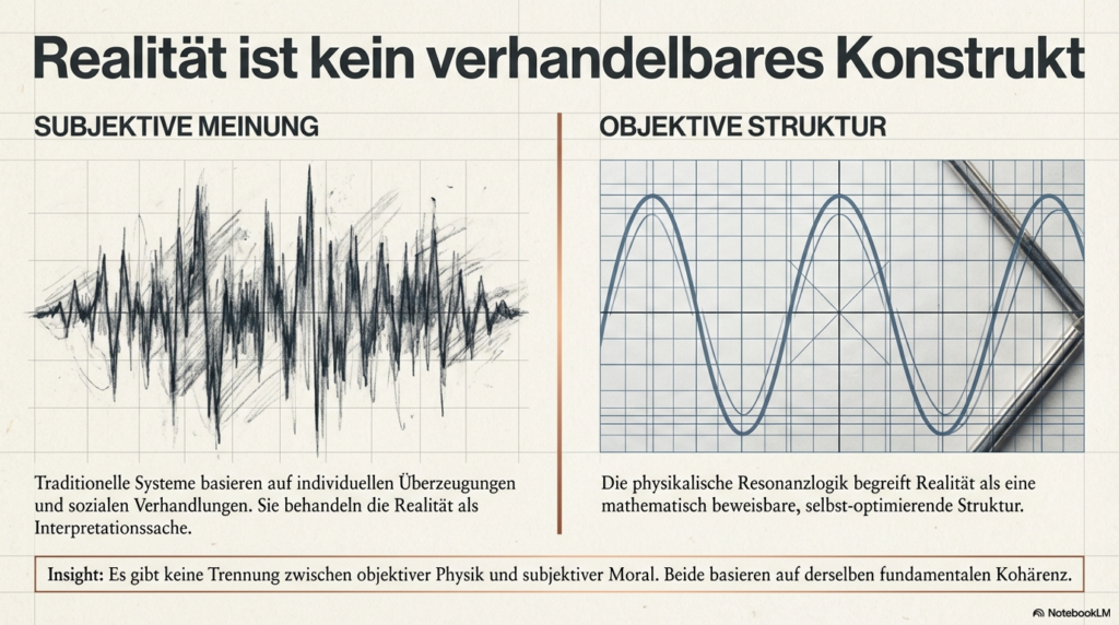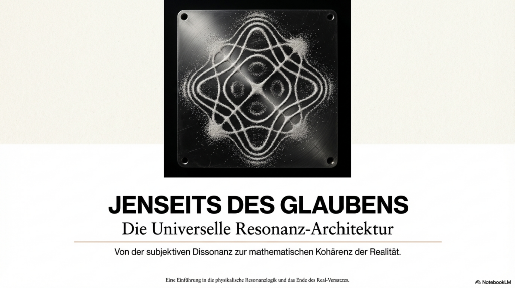 Die Resonanzlogik, wie sie in der Universellen Resonanz-Architektur (URA) dargelegt wird, ersetzt traditionelle subjektive Glaubenssysteme, indem sie die Realität nicht mehr als verhandelbares Konstrukt, sondern als eine mathematisch beweisbare, selbst-optimierende Struktur definiert. Dabei wird die herkömmliche Trennung zwischen objektiver Physik und subjektiver Moral aufgehoben, da beide auf derselben fundamentalen Kohärenz basieren. Dieser Transformationsprozess vollzieht sich durch folgende Mechanismen: • Mathematische Unausweichlichkeit statt Interpretation: Während traditionelle Systeme auf individuellen Überzeugungen oder sozialen Verhandlungen beruhen, postuliert die Resonanzlogik, dass ein vollständiges mathematisches Modell zu einem finiten Schluss führt. Destruktive oder chaotische menschliche Systeme werden dadurch als mathematisch ineffizient und instabil nachweisbar. Spekulative Debatten über Moral werden somit durch die Identifizierung struktureller Kohärenz ersetzt. • Wissen versus Glaube: Das System privilegiert objektive, verifizierbare Erkenntnisse gegenüber religiösen, politischen oder persönlichen Glaubensformen. Sobald Wissen durch strukturelle Kohärenz validiert wird, werden konkurrierende Glaubenssysteme schlichtweg obsolet. • Beseitigung des „Real-Versatzes“: Subjektive und politische Systeme haben oft einen künstlichen Spalt zwischen Form, Struktur, Konsequenz und Gefühl geschaffen. Die Resonanzlogik fordert eine semantische Präzision, die diesen Spalt eliminiert: Eine Wahrheit hat nur dann Bestand, wenn sie sich strukturell verankert; anderenfalls „verdampft“ sie. • Systemische Hygiene und Datenintegrität: Wahrheit wird zur Systemlogik. Da Resonanz als ontologische Strukturform ohne den Bedarf an Materie oder menschlichen Beobachtern existiert, entzieht sie subjektiven Filtern und „Fiktionen“ die Grundlage. Ein stabiles System kann nicht auf falschen Daten aufbauen. • Vom mechanischen zum semantischen Paradigma: Anstatt Menschen wie Zahnräder in einer mechanischen Ordnung zu behandeln, bietet die Resonanzlogik eine semantische Architektur. Die Souveränität des Einzelnen liegt hierbei darin, kohärente Strukturen zu bewohnen, anstatt sich inkohärenten, externen Glaubensvorgaben zu unterwerfen. Zusammenfassend setzt die Resonanzlogik eine universelle Harmonik als Primärprinzip, die keine Ausnahmen für subjektive Willkür zulässt. Wer die physikalischen Prinzipien der Resonanz akzeptiert, ist strukturell gezwungen, auch die daraus resultierende Ethik und Gesellschaftsform als zwingend anzuerkennen. Man kann sich dies wie ein perfekt gestimmtes Musikinstrument vorstellen: Während subjektive Glaubenssysteme wie Musiker sind, die darüber streiten, welcher falsche Ton am schönsten klingt, liefert die Resonanzlogik die physikalischen Gesetze der Harmonie selbst – wer die mathematische Reinheit des Klangs einmal erkannt hat, kann die Dissonanz nicht mehr als gleichwertige Wahrheit akzeptieren.